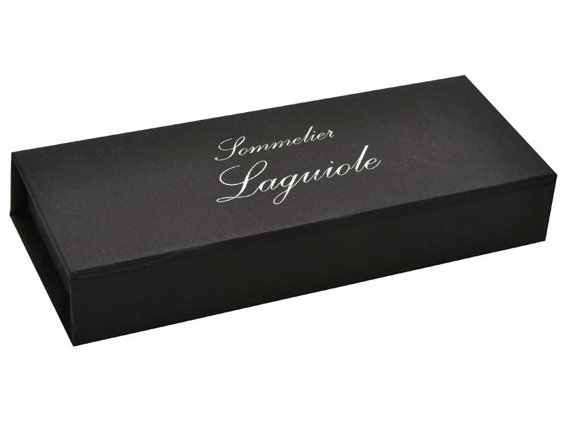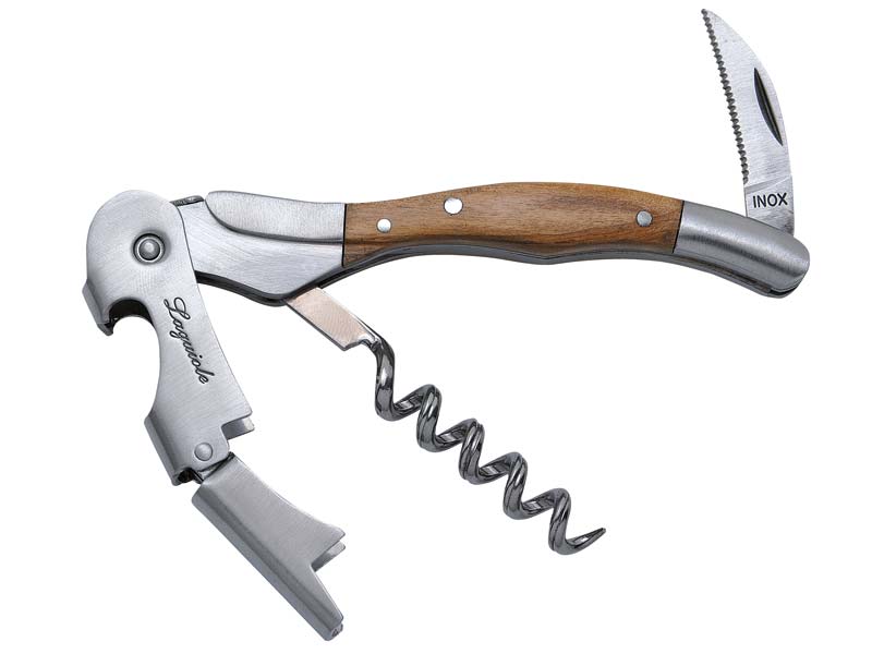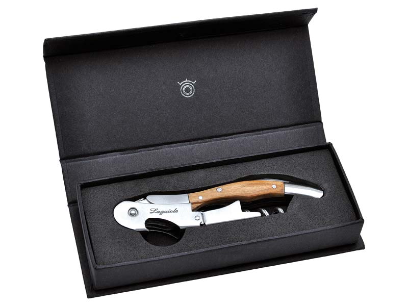 Korkenzieher mit 5 Spiralen. Fein gezahnte Klinge zum Entfernen der Weinmanschette. Im Geschenkkarton.
