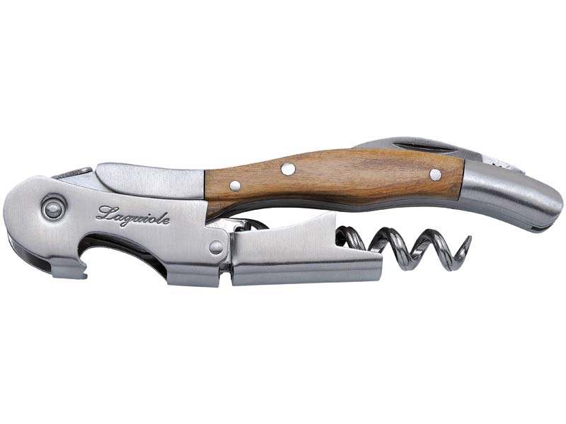 Professionelles Laguiole Kellnermesser mit Doppelhebel. Griff aus Olivenholz mit zwei Backen aus rostfreiem Edelstahl.